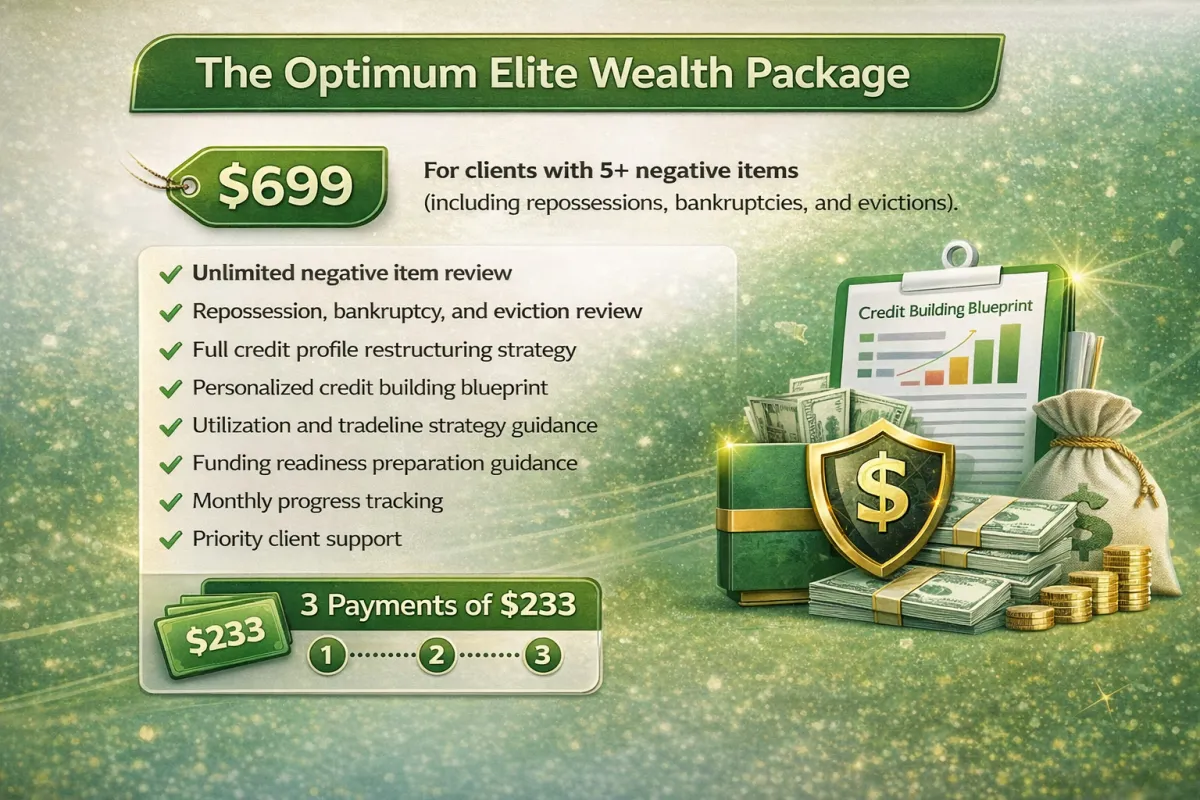 Includes everything in previous packages plus advanced credit building and funding preparation.